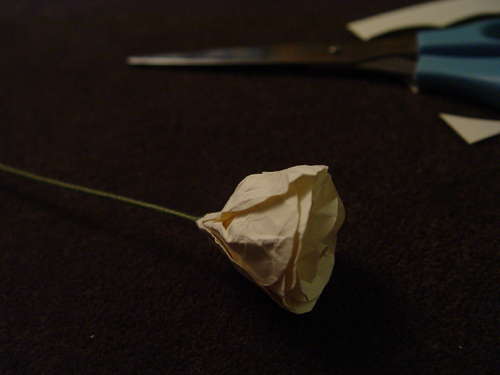 B2: Sau khi cắt được những cánh hoa và và vò giấy nhàu rồi, bạn hãy thực hiện cuốn tròn chúng vào và để lộ phần nhỏ cao hơn một chút để làm phần nhị bông hoa.